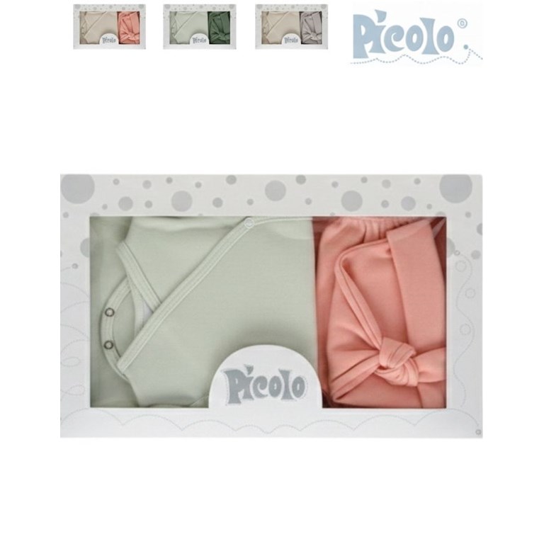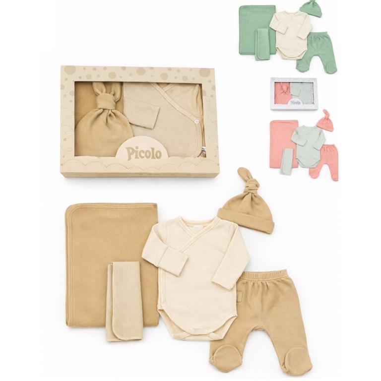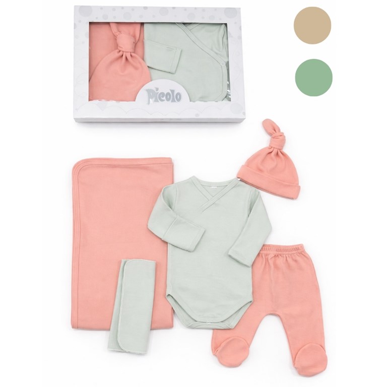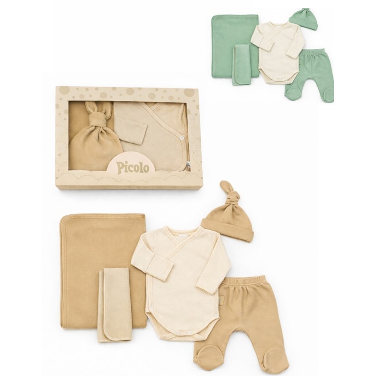Ajuar 5u Body abto c/ gte - pant - gorro - mantilla doble - babita. interlock. Picolo
