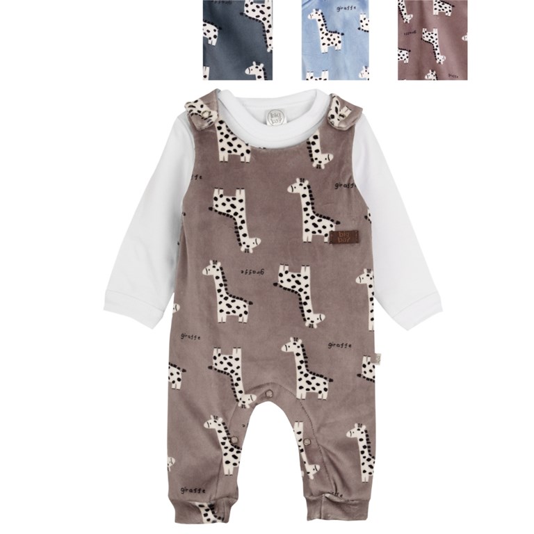 CONJUNTO BEBE JARDINERO DE PLUSH ESTAMPADO JIRAFAS + BODY MANGA LARGA. BIG BAY