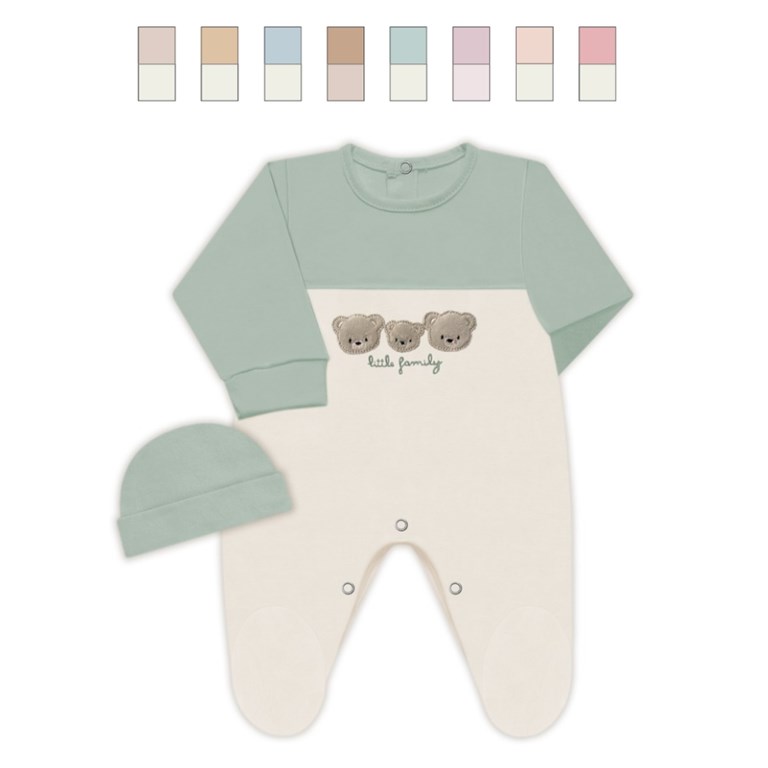 Enterito BB, interlock comb. canesú, gorro y mangas, bordado central, c/pié, nena y varón. Dreams