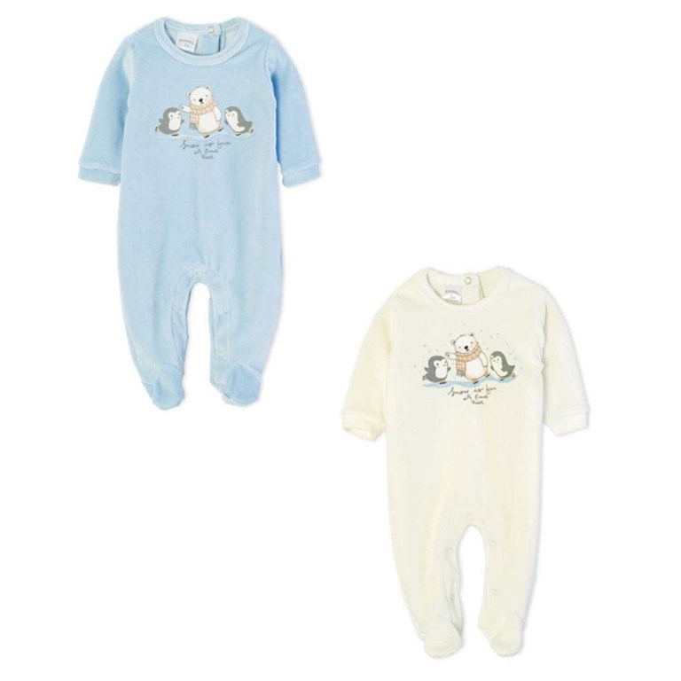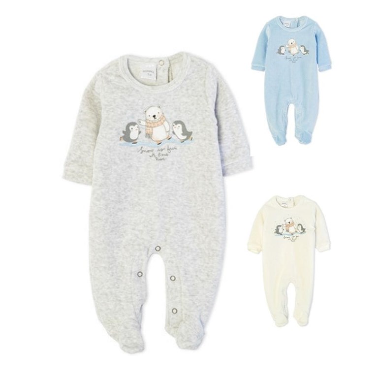 ENTERITO DE PLUSH CON PIE PARA BEBE ESTAMPA PINGUINITOS. RUABEL