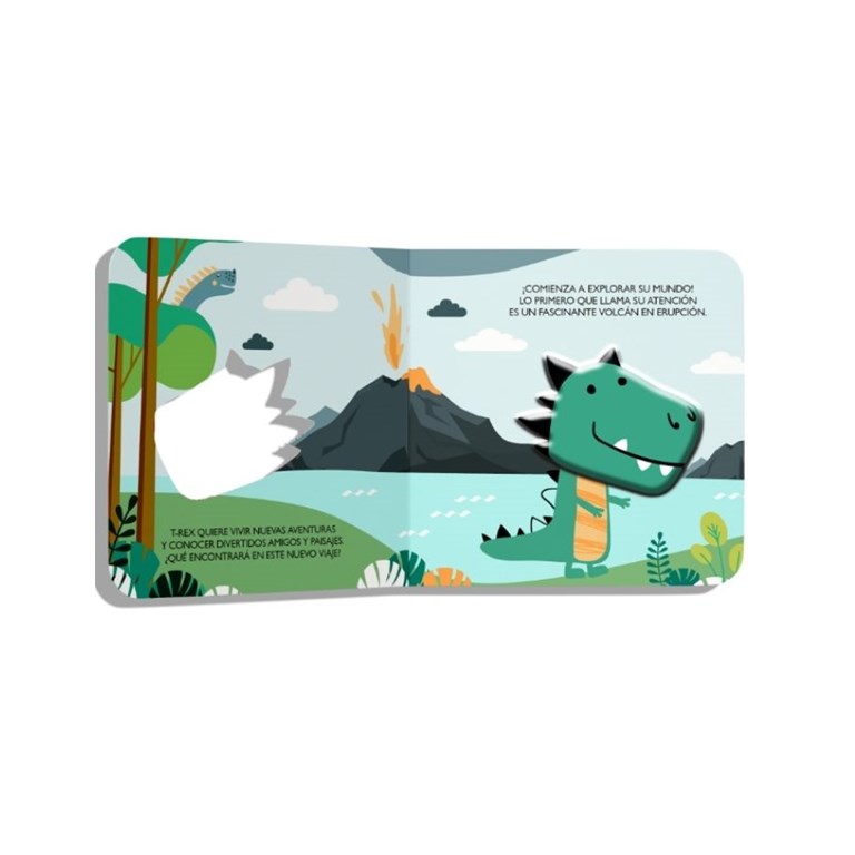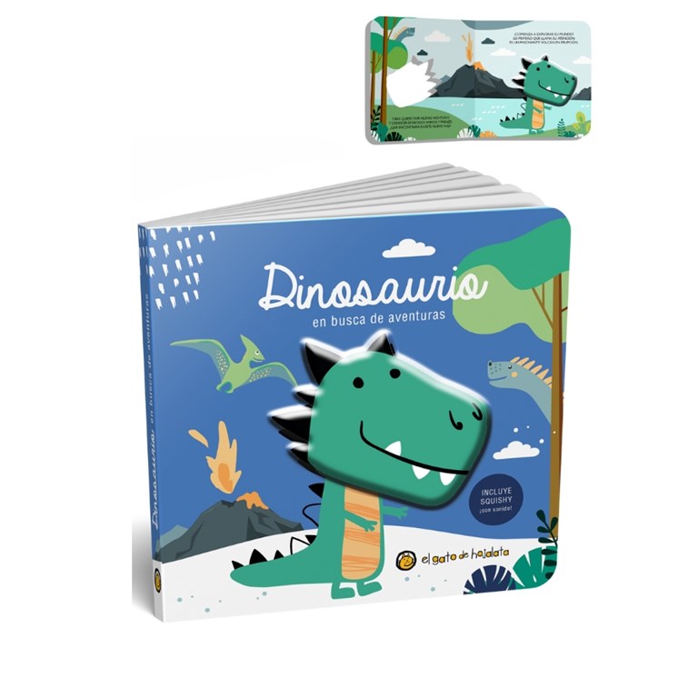 LIBRO ILUSTRADO DINOSAURIOS, SQUISHY CON CHIFLE EN TAPA. GATO DE HOJALATA. MED. 18 X 18 CM