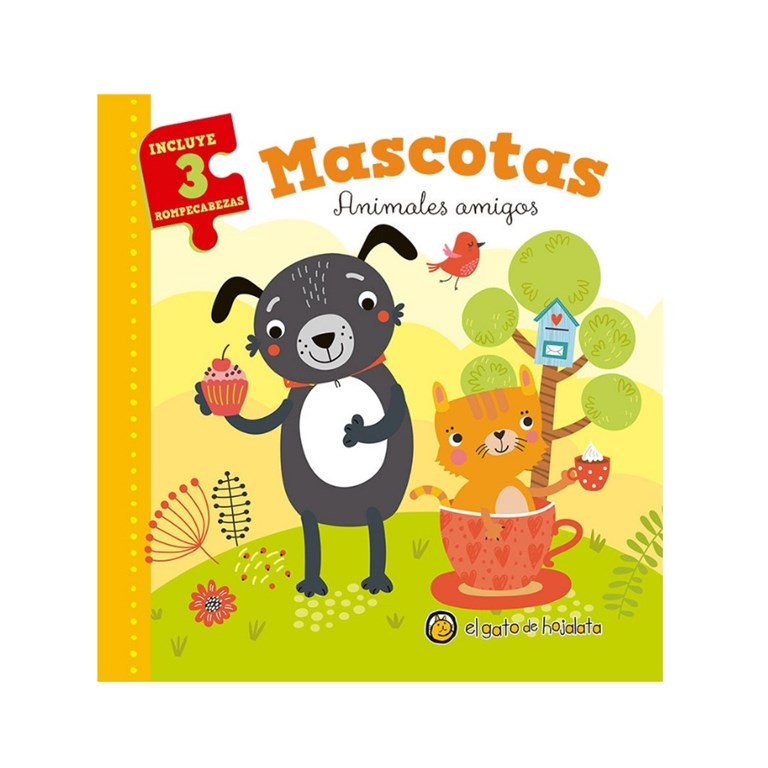 LIBRO ILUSTRADO MASCOTAS , REUNIDAS EN PEQUEÑAS HISTORIAS , INCLUYE 3 ROMPECABEZAS DE 9 PIEZAS. GATO DE HOJALATA. MED.20 X 20 CM.