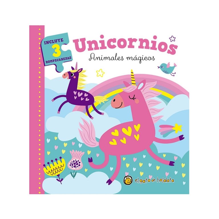 LIBRO ILUSTRADO UNICORNIOS , CREANDO PEQUEÑAS HISTORIAS, INCLUYE 3 ROMPECABEZAS DE 9 PIEZAS. GATO DE HOJALATA. MED. 20 X 20 CM.