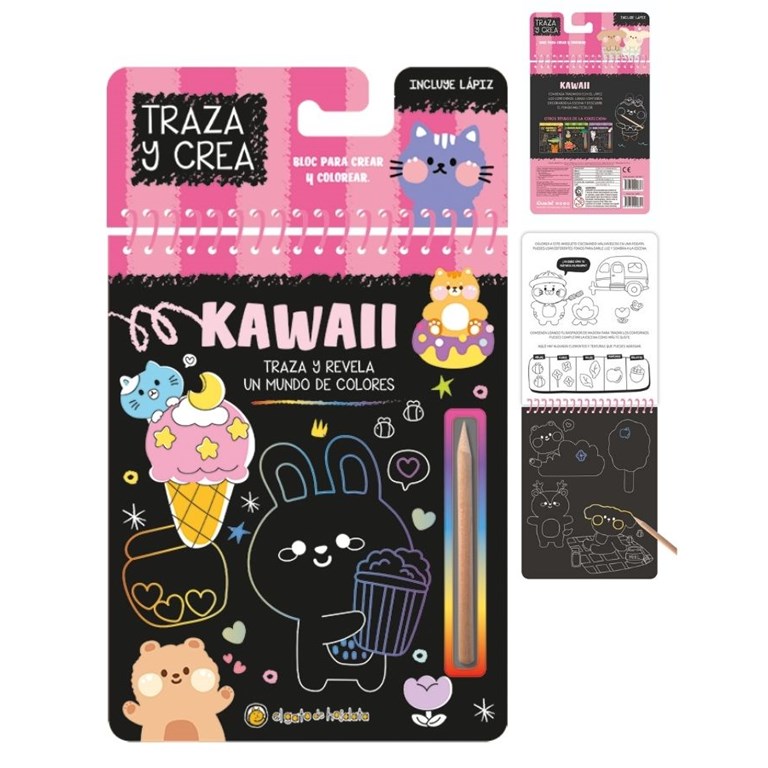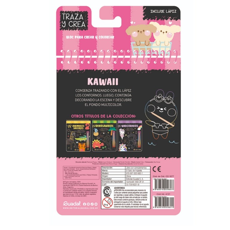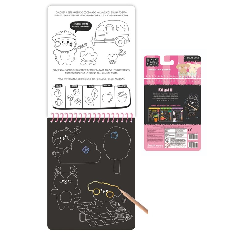 LIBRO KAWAII , PARA CREAR Y COLOREAR FORMAS CON LAPIZ DE MADERA QUE INCLUYE. GATO DE HOJALATA. MED. 15 X 19 CM.