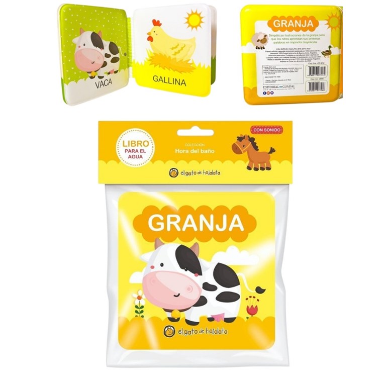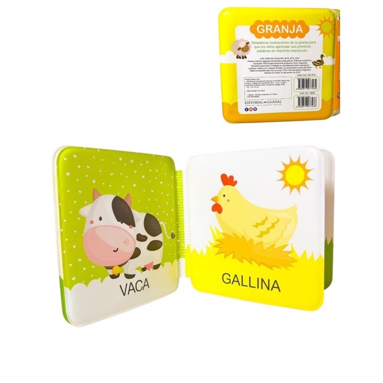 LIBRO PARA EL AGUA ESTAMPADO ANIMALES DE LA GRANJA. GATO DE HOJALATA. MED. 15 X 15 CM.