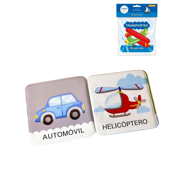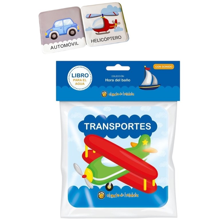 LIBRO PARA EL AGUA ESTAMPADO TRANSPORTES. GATO DE HOJALATA. MED. 15 X 15 CM.