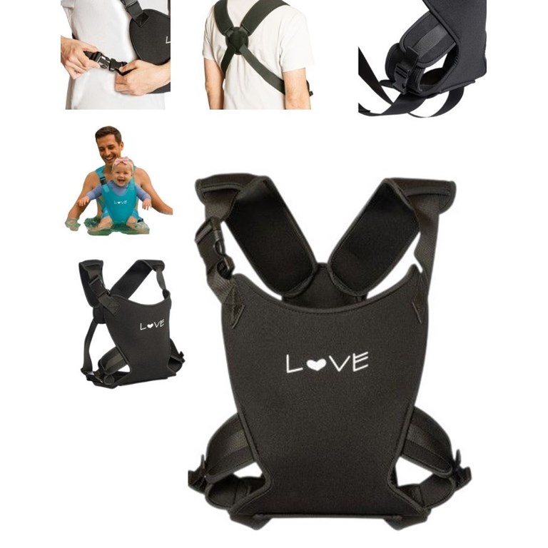 MOCHILA PORTA BEBE ACUATICA Material de Neoprene para usar en el agua. 2 posiciones: Mirando al frente o atrás. 2 correas para ajustar el largo y facilitar la colocación. LOVE