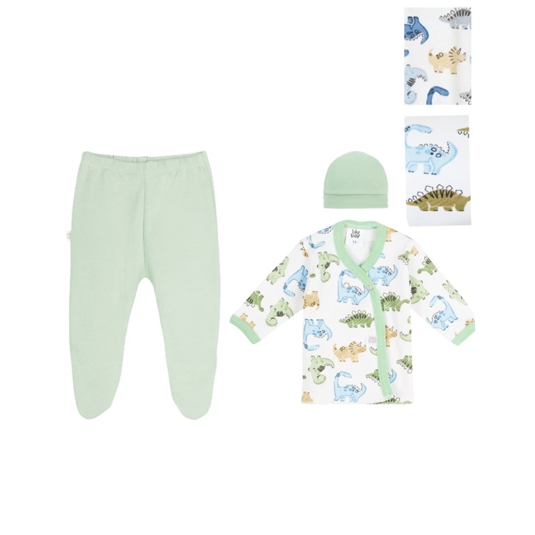 SET 3 PIEZAS BATITA ESTAMPADO DINO + MEDIO OSITO Y GORRO LISO. BIG BAY