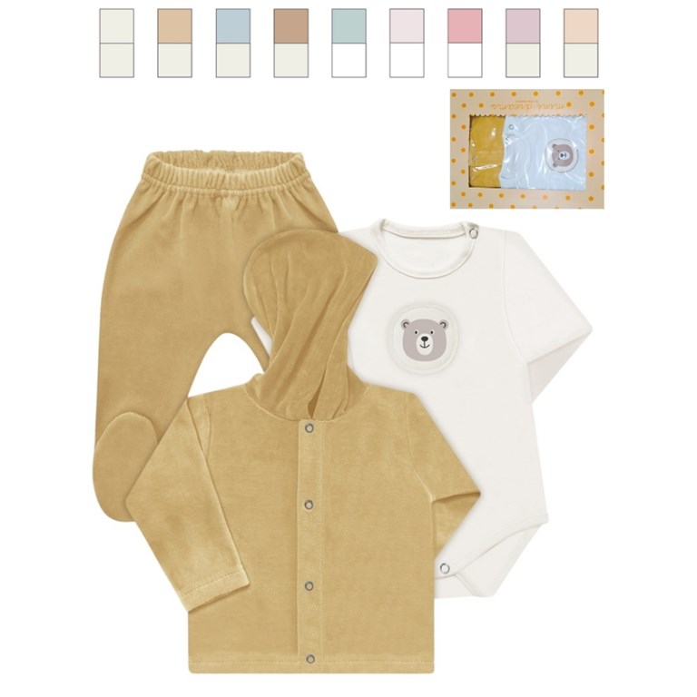 Set 3 piezas en caja, body con aplique estampado/bordado, campera con capucha y ranita en plush liso. Nena y varo. Dreams