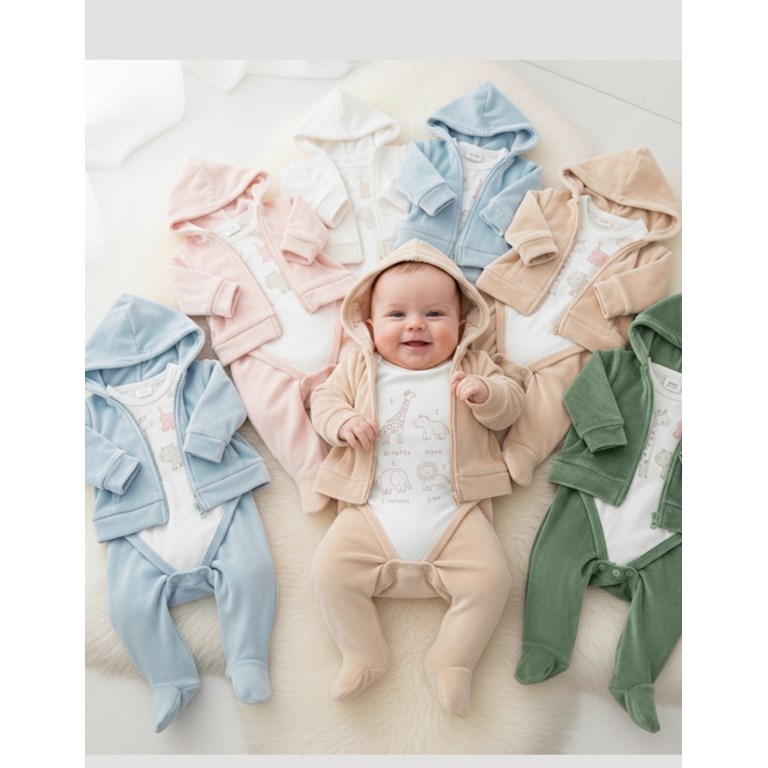 Set 3 piezas, body estampado central, campera con capucha y ranita de plush, nena y varón. Dreams