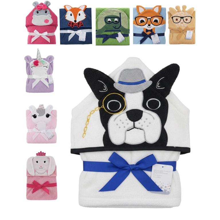 Toallon con capucha con bordado 3D. Medidas: 70 x 70 cm. Bordados de diez animales distintos unisex, nena y varon.